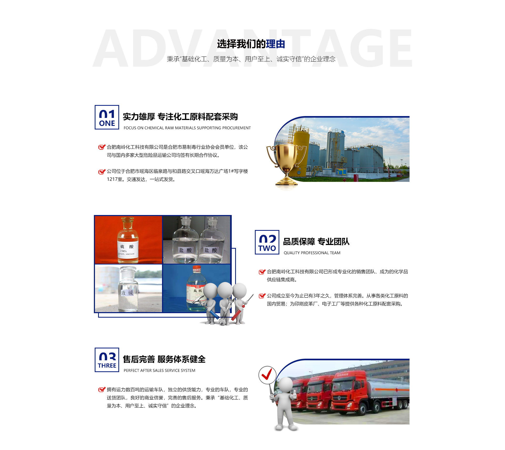 關(guān)于我們合肥南嶺化工科技有限公司是合肥市易制毒行業(yè)協(xié)會會員單位,該公司與國內(nèi)多家大型危險品運輸公司均簽有長期合作協(xié)議,擁有運力數(shù)百噸的運輸車隊,獨立的供貨能力,良好的車隊運輸,有效的送貨團隊,良好的商業(yè)信譽,完善的售后服務(wù)。秉承“基礎(chǔ)化工、質(zhì)量為本、用戶至上、誠實守信”的企業(yè)理念。從事各類化工原料的國內(nèi)貿(mào)易;為各個化工廠、印刷皮革廠、電子工廠等提供各種化工原料配套采購。目前,公司正朝著以貿(mào)易為基礎(chǔ)、以實業(yè)為依托,采購、銷售,內(nèi)外貿(mào)一體化,上下游一體化,具有綜合增值能力和復(fù)合競爭能力化工原料供應(yīng)商。本公司主要經(jīng)營的產(chǎn)品有:鹽酸、硫酸、液堿、片堿等。合肥南嶺化工科技有限公司已形成服務(wù),售后一體化的團隊、成為的化學(xué)品供應(yīng)鏈集成商。為客戶提供良好的服務(wù)及產(chǎn)品,本公司經(jīng)銷的各種產(chǎn)品不僅在安徽地區(qū)深受用戶好評,而且具有很高的市場占有率,產(chǎn)品行銷各個地區(qū)。